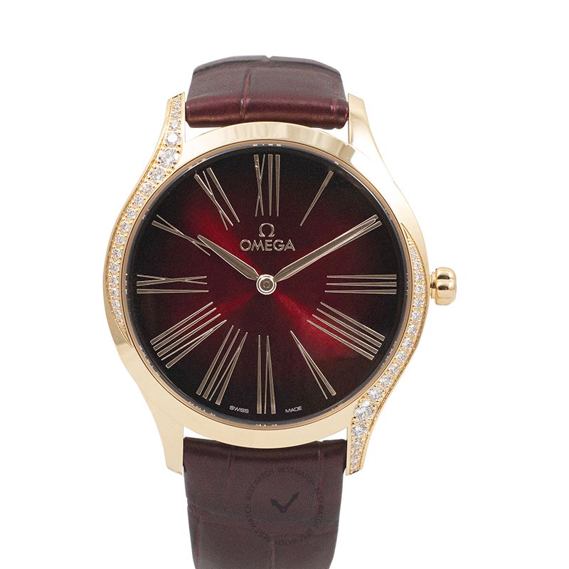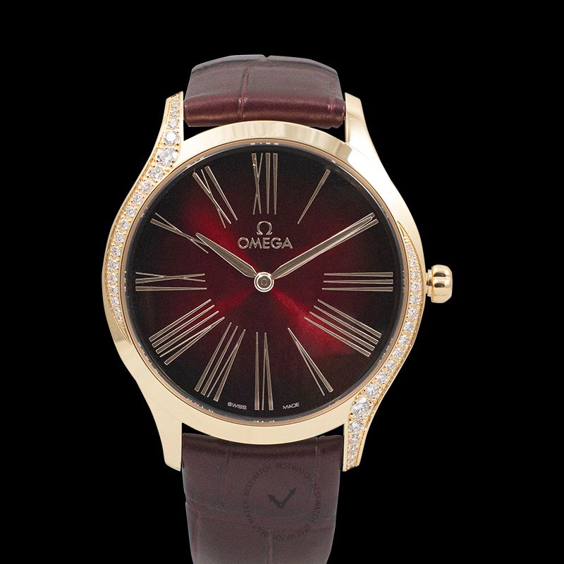 - Hands Rose Gold hands and Roman Numeral hour markers on a Burgundy Dial